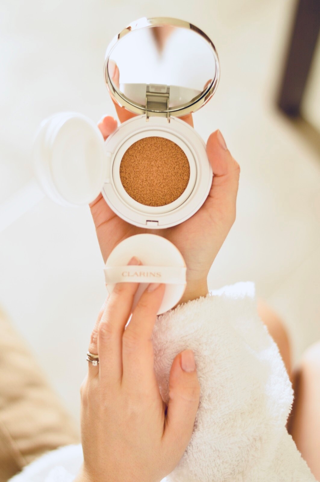 Ottimo anche il fondotinta cushion, una delle ultime novità di Clarins, Everlasting Cushion Foundation che abbina all’azione idratante e un SFP 50, coprenza e luminosità.