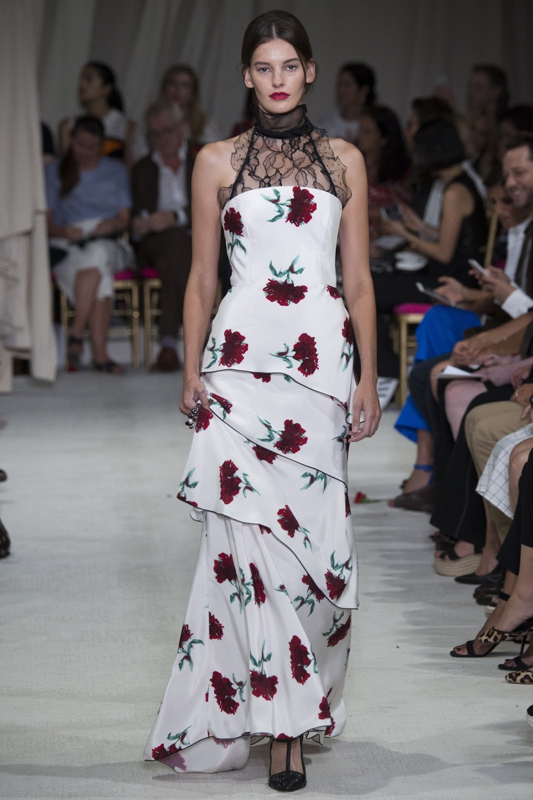 In passerella pizzi ricercati, ruches, volumi, tanto rosso e nero…e gli immancabili fiori, rossi, su abiti lunghi e morbidi.