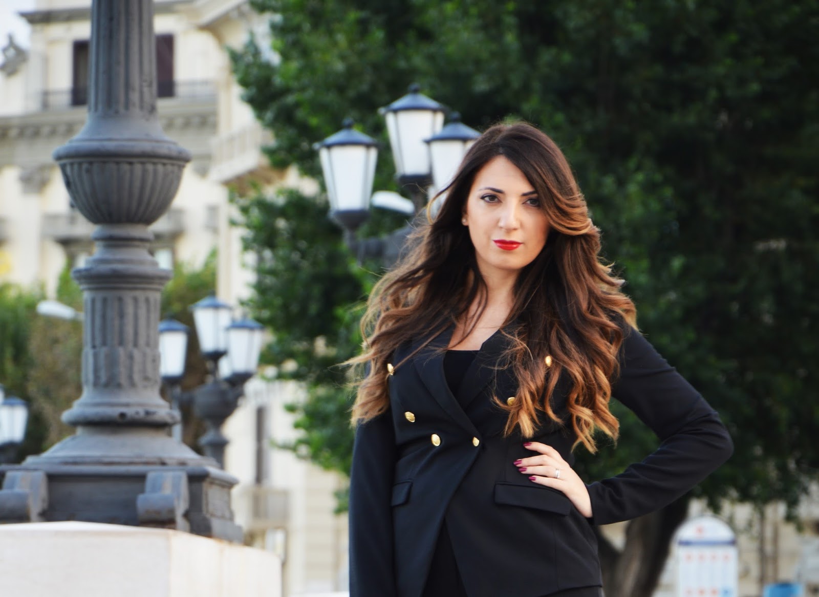 Sfatiamo il mito del tailleur antico e pluricentenario. Il tailleur ora si reinventa e lo fa seguendo le ultime tendenze. Io vi mostro il protagonista del mio outfit di oggi: un tailleur giacca e pantalone di OVS con bottoni dorati stile army, che riprendono quelli delle classiche divise militari.