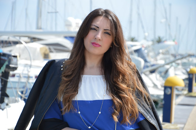 Per il seguente periodo, non essendo ancora particolarmente mite, ho deciso di abbinare alla mia tuta un giubbino in pelle con delicate borchie oro che riprendono il tacco stiletto gold delle mie pumps Violavinca.