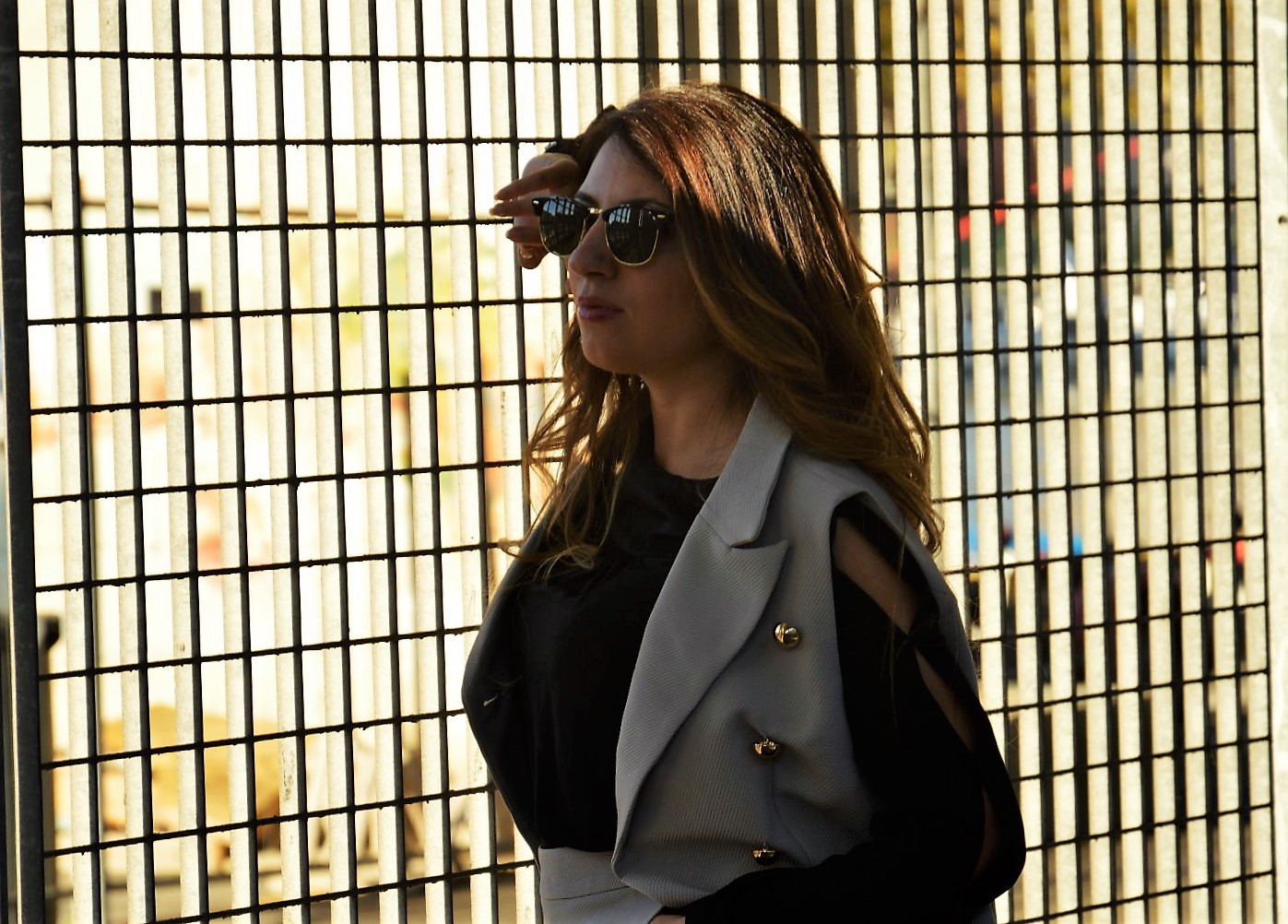 Indosso una camicia nera in voile e aperture sulle maniche e un completo grigio chiaro composto da shorts e gilet con bottoni gold a contrasto, abbinati ad un paio di ankle boots dal tacco stiletto e dettagli oro.