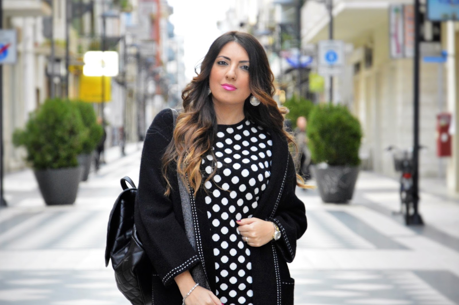 Indosso un abito con manica a 3/4 in morbida lana con pois bianchi su sfondo nero abbinati ad un bellissimo cappottino nero con delicata impuntura bianca che riprende i toni del vestito.