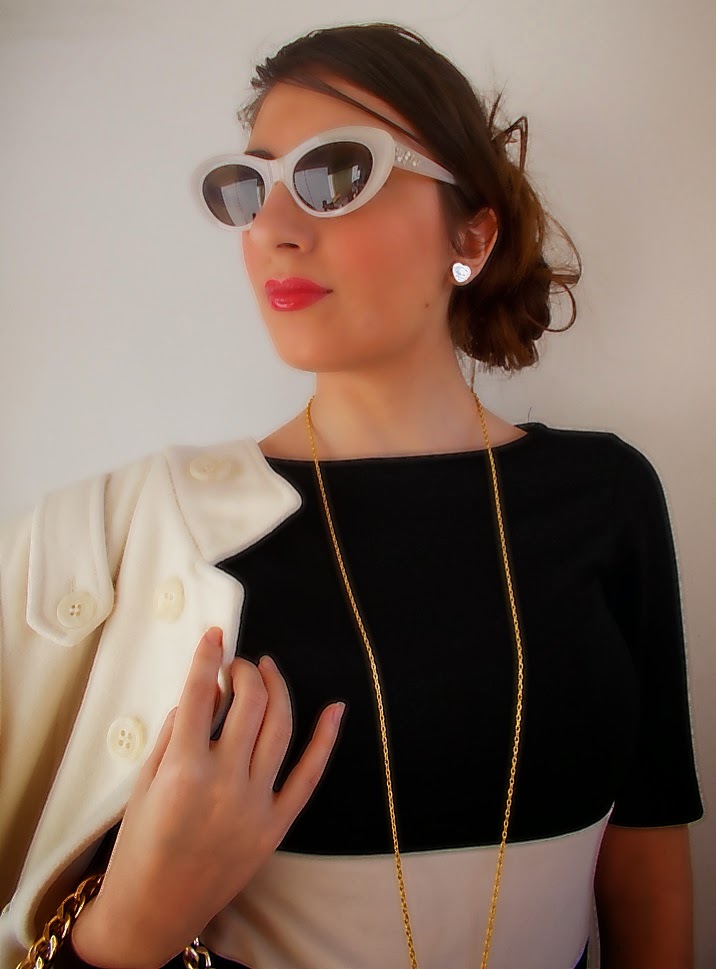 Ho pensato ad un outfit giusto per questo lunedi e ho deciso di proporvi un look molto femminile e ispirato agli anni 60, epoca che adoro. I colori predominanti sono due dei miei preferiti in assoluto: bianco e nero, nettamente contrapposti ma compatibili nella loro diversità.