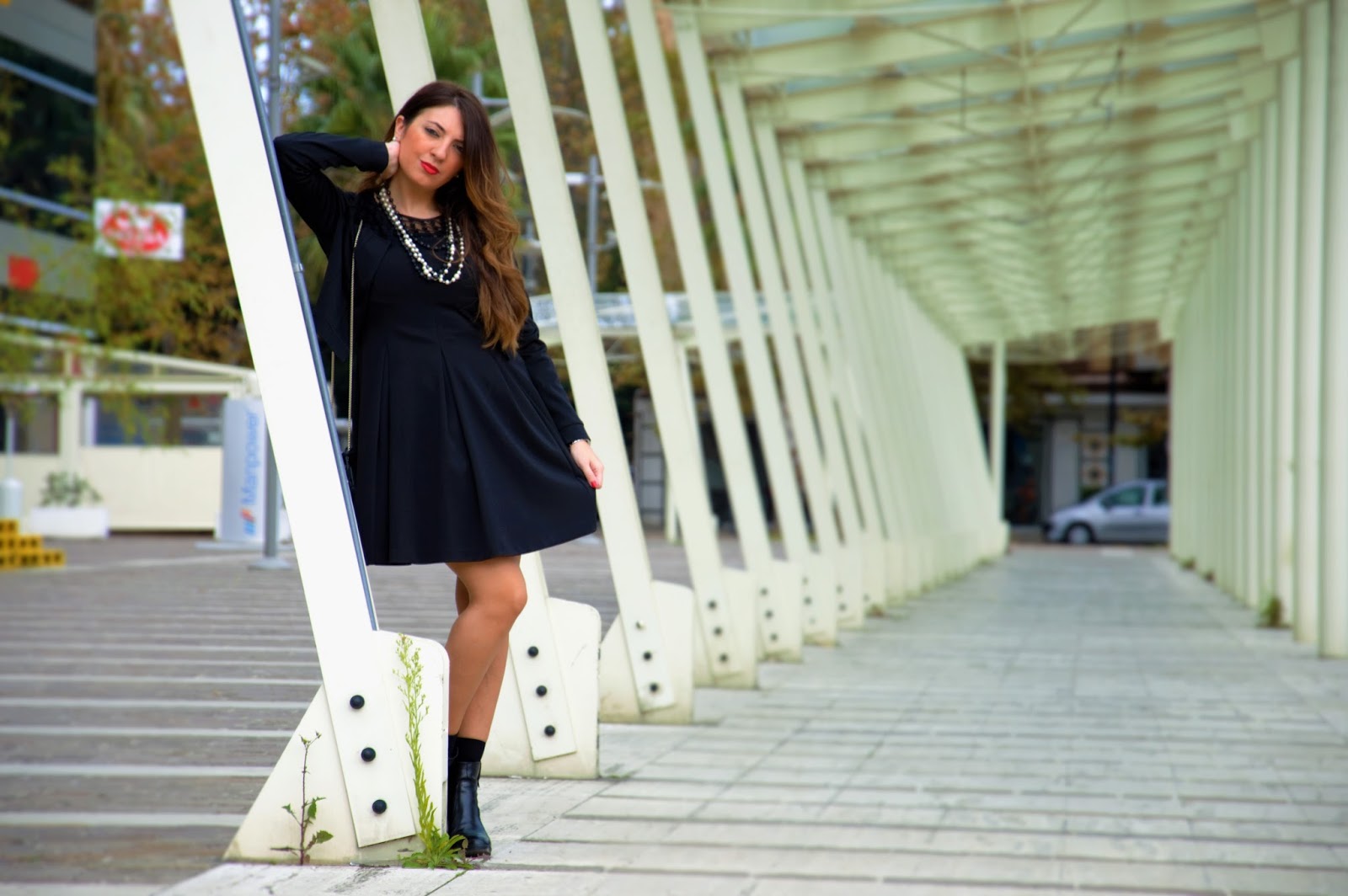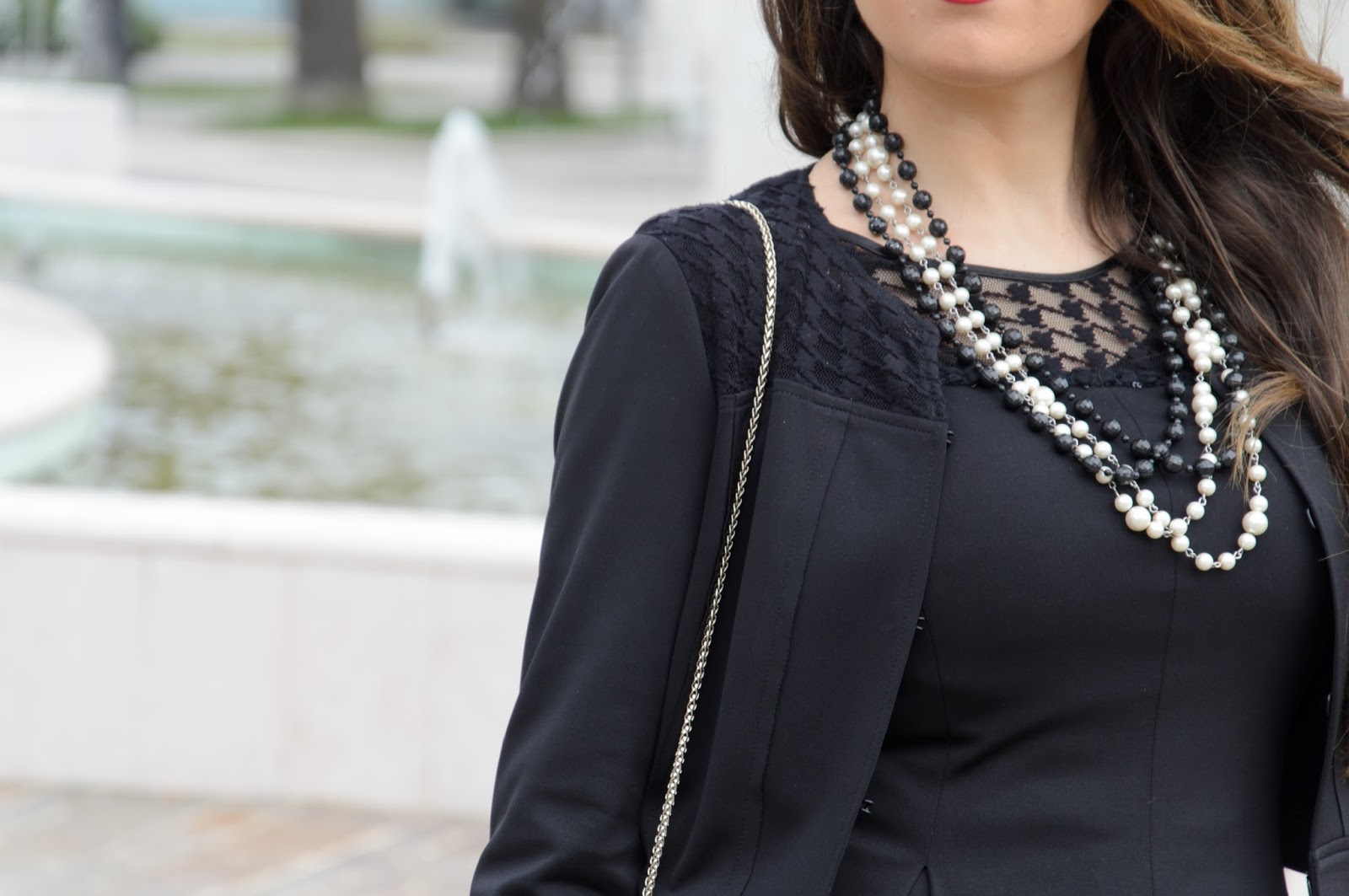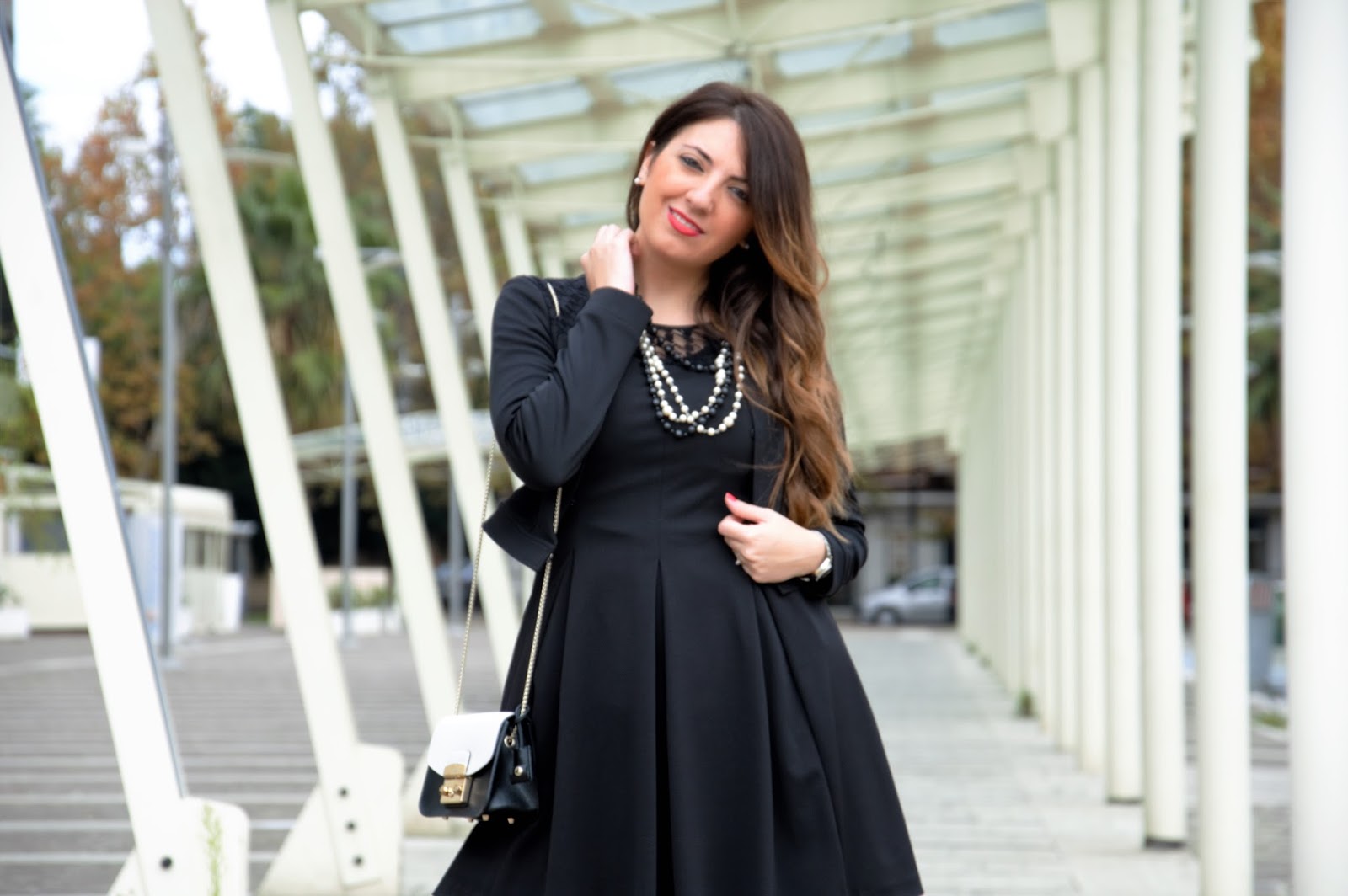 Ho deciso di abbinare un filo di perle bianco e nero ad un look total black. Indosso un abito nero con bolero di Elisa Landri, questa sarà il primo look di novembre e nelle prossime settimane vi attenderà un altro look con uno dei principali trend di questa stagione.